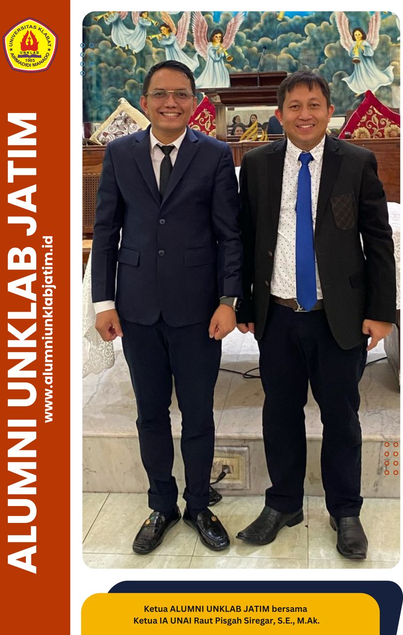 [www.alumniunklabjatim.id] - Sabtu, 22 Maret 2025 di Surabaya Ketua Alumni Unklab Jatim Pdt. D. Sompotan, M.H., M.Fil. berkesempatan bertemu dan berdiskusi dengan Raut Pisgah Siregar, S.E., M.Ak. Ketua Ikatan Alumni UNAI (Universitas Advent Indonesia) Bandung Barat Jabar.